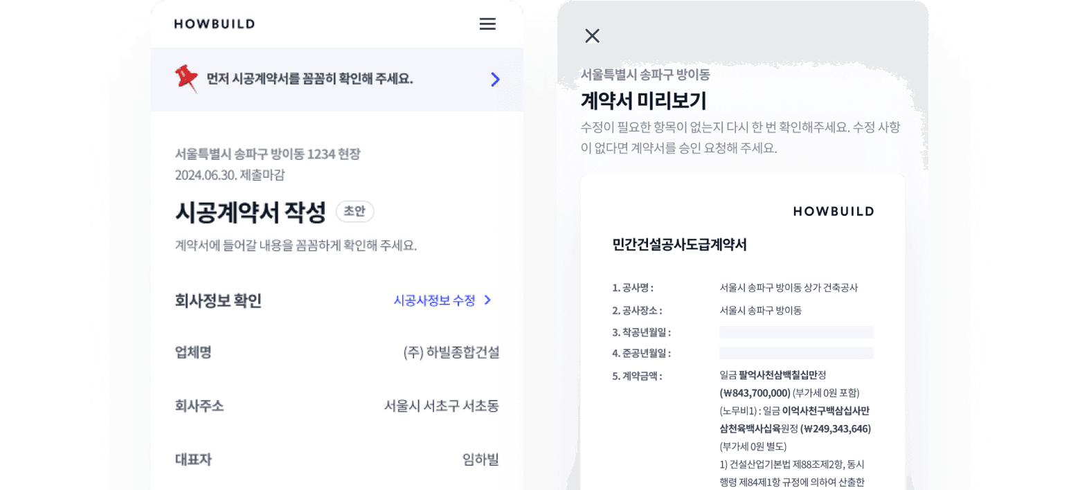 플랫폼에서 전자계약을 체결할 수 있으며 현장대리인, 공사 기간 등을 수정할 수 있어요