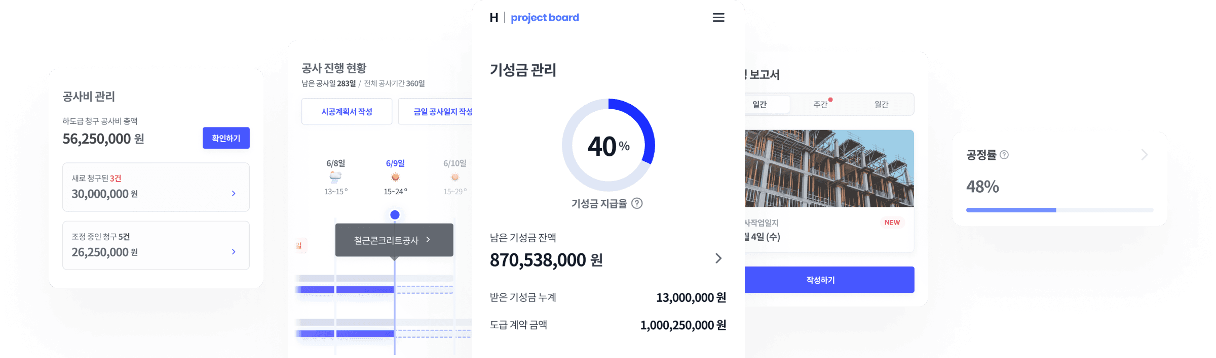 공사비 관리, 진행 현황, 공정률 등 공사 현장에 필요한 모든 업무를 한눈에 확인해 보세요