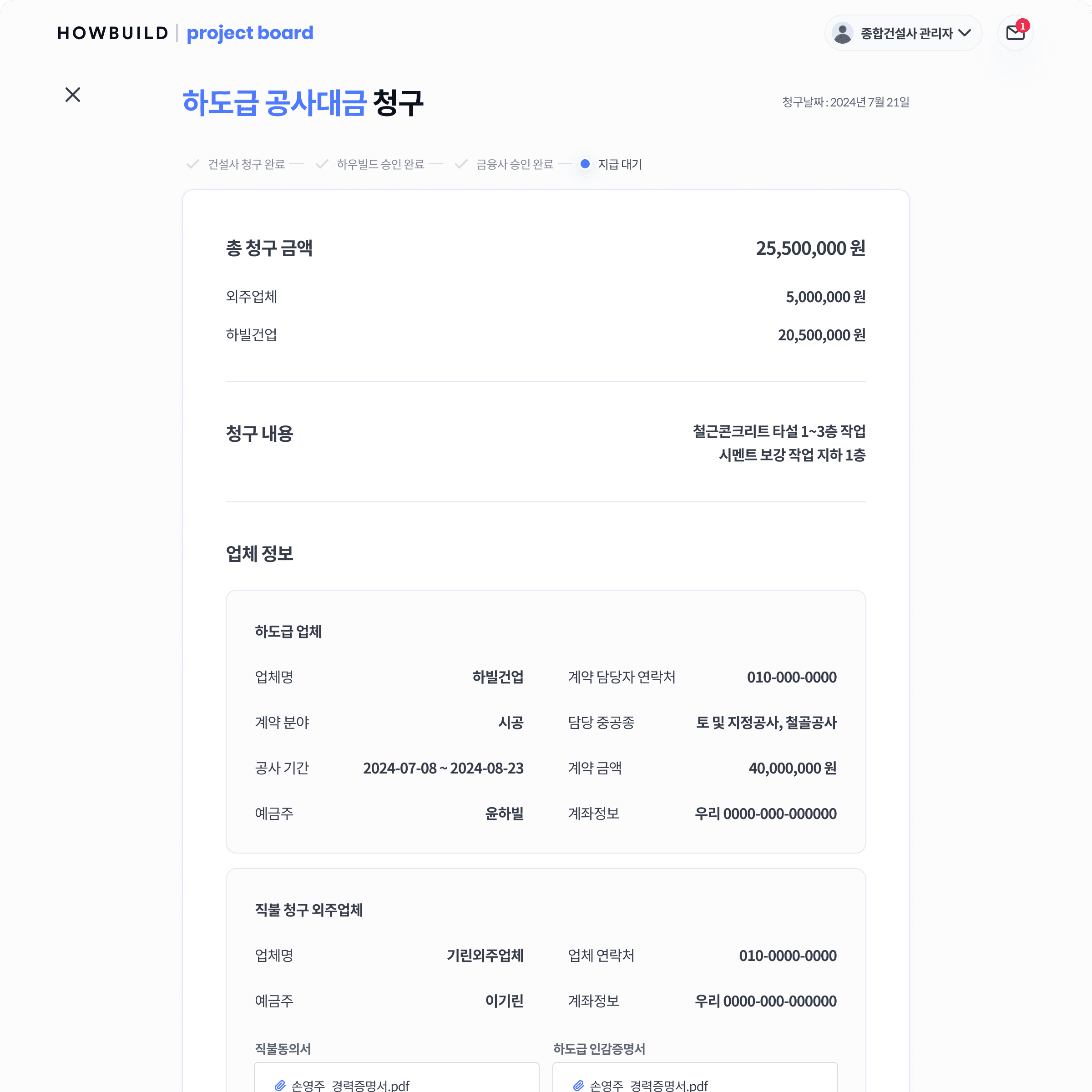 공정보고서에 따라 공정률이 산정되며, 기성청구서 생성 및 청구가 가능해요